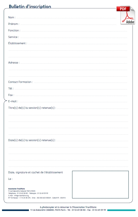 Association TranSFaire 9 rue Jean Daudin 75015 PARIS Tél : 01 53 69 08 80 Fax : 01 53 69 09 99 info@transfaire.orgVous inscrire